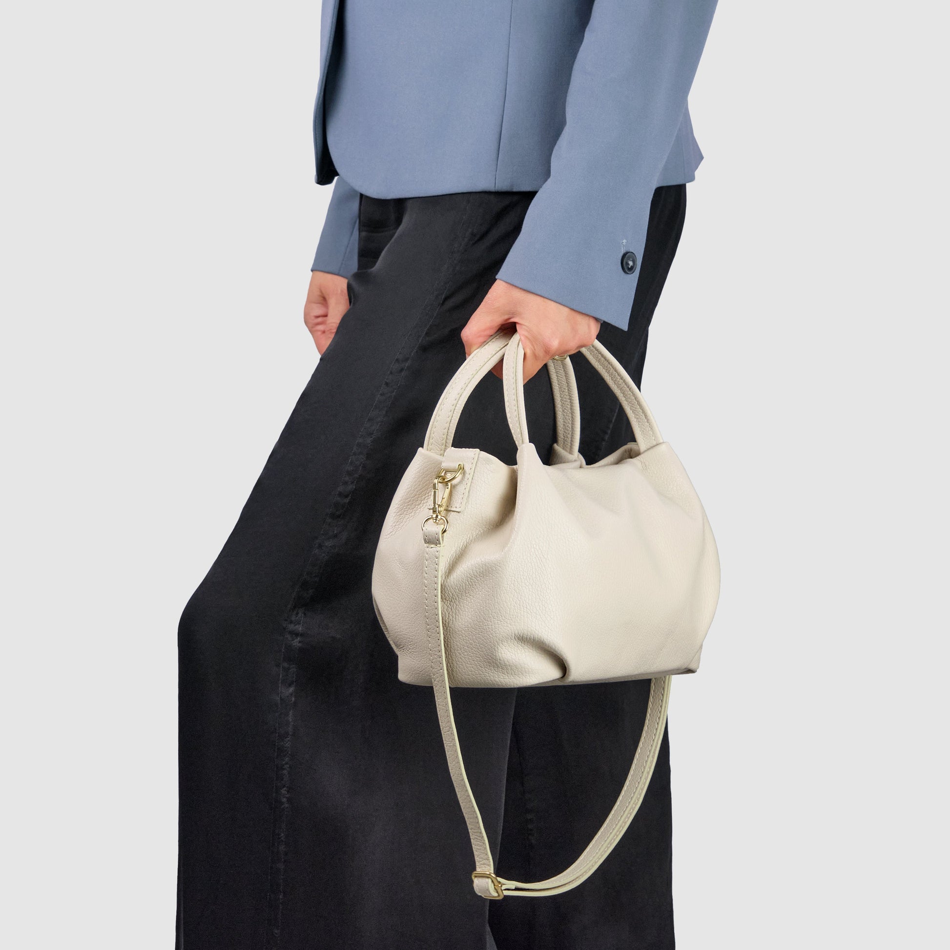 This handbag is the embodiment of elegant Italian restraint. Its sculptural shape with soft curves and rounded sides creates a feminine and modern silhouette that stands out effortlessly. Handcrafted in Italy, the model reflects exceptional attention to detail and quality.